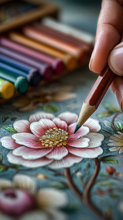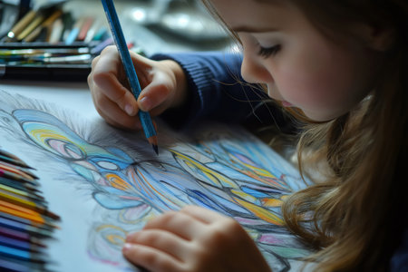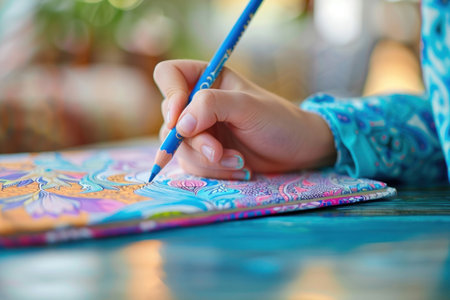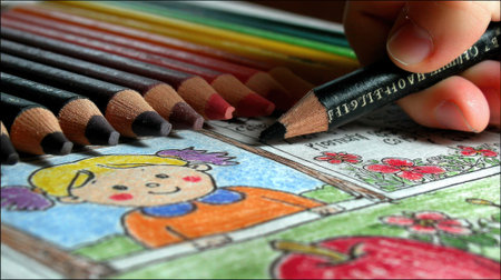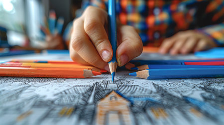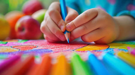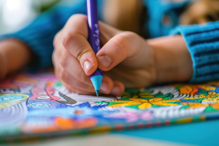 A childs hand holding a colorful pencil, intricately coloring a page in a book, fostering creativity and cognitive growth.