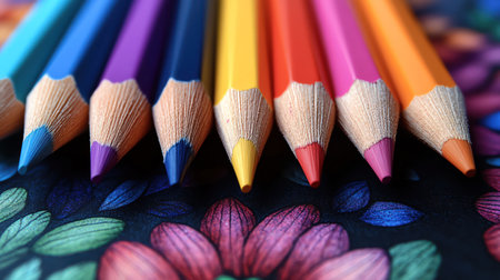 Discover a close-up view of vibrant colored pencils positioned on a beautifully designed artistic background, showcasing the essence of creativity and artistry.