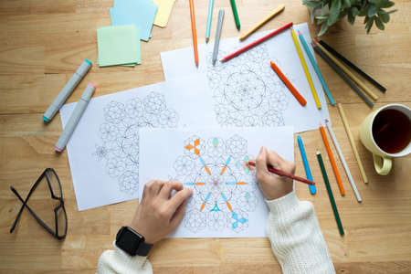 A woman using some color pens painting a mandala book for adults. Mindfulness activity. Empty copy space for editor's text.