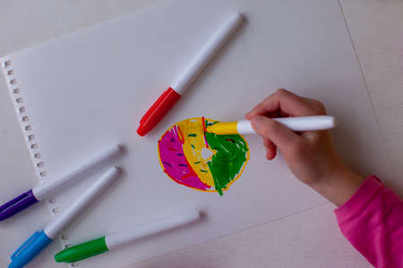 Child's hand drawing picture on a paper