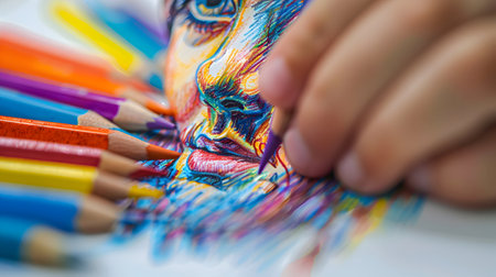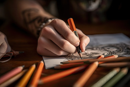 Artist working on a detailed colored pencil drawing, great for creative hobby themes. With Generative AI technology.