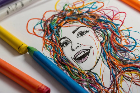 Children's drawing of a woman with colorful pencils on white paper