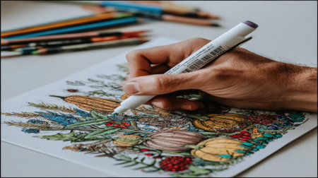 A close up view of a hand using a marker to color a detailed floral and botanical illustration. This creative hobby promotes mindfulness and relaxation.