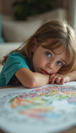 A young girl with long brown hair gazes thoughtfully at her colorful mandala drawing, resting her chin on her arms. The image captures a moment of creativity and contemplation, highlighting the joy and focus of childhood art.