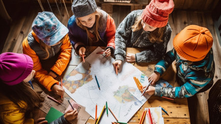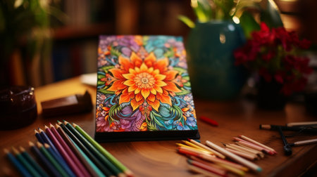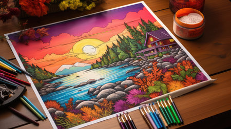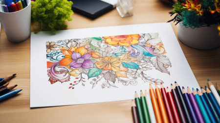 Coloring book activity on table with pencils generated by artificial intelligence