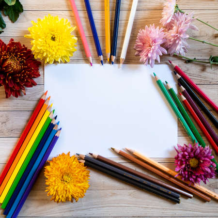 Chrysantemum autumn bouquet pencils copy space blanc paper colored colorful mock up
