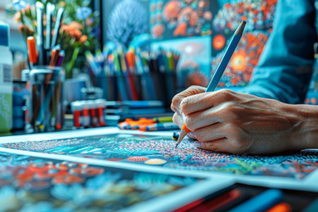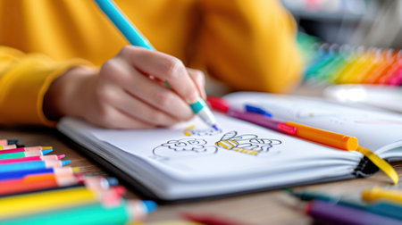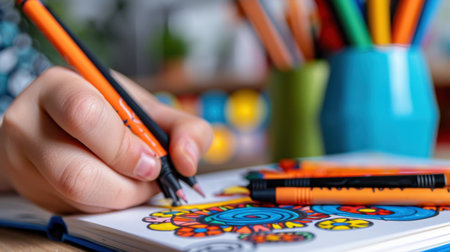 A close-up of a hand engaging in a colorful art project using vibrant markers. The creative workspace is filled with inspiration, showcasing tools for artistic expression.