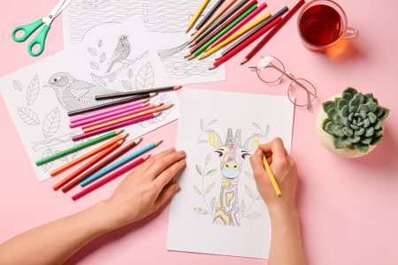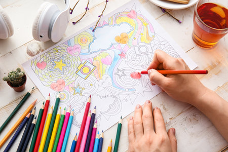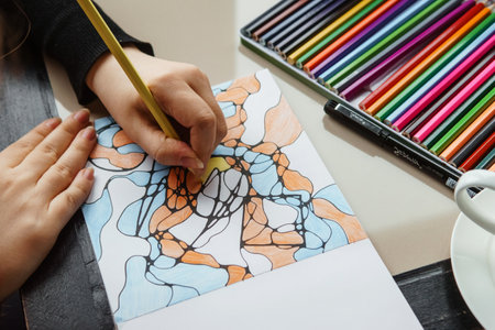 Image of woman coloring, adult coloring book trend, for stress relief. top view. colorer - antistress with colored pencils. Adult coloring books. The woman draws thereby relieves stress