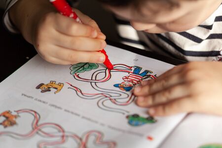 Small boy at home drawing lines in book hometask