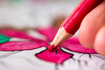 A close up macro portrait of fingers of a hand holding a red wooden pencil coloring in a flower in a coloring book for adults. The color is nicely drawn in between the lines of the drawing.