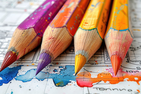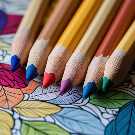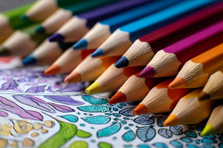 Closeup of sharpened colored pencils arranged on a vibrant coloring page