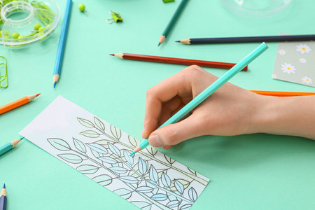 Woman coloring bookmark on color background
