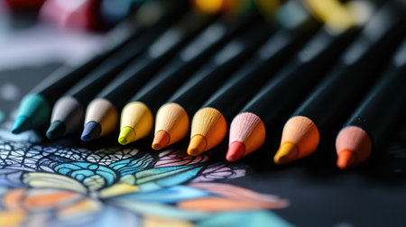 A set of vibrant colored pencils on a detailed coloring page with intricate black line patterns, perfect for inspiring creativity and relaxation.