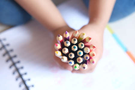 top view of child girl holding many color pencils