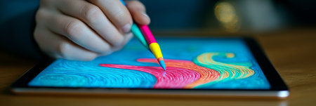 Close-up Hand skillfully uses digital stylus, creating vivid, abstract artwork on a modern tablet.