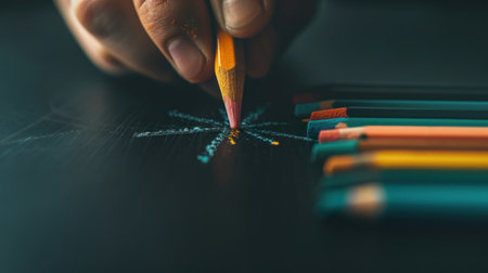 someones hand holding a pencil and drawing on a piece of paper with colored pencils in the background. Generative Ai