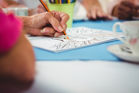 Woman coloring an adult coloring book, new stress relieving trend, mindfulness concept, hand detail