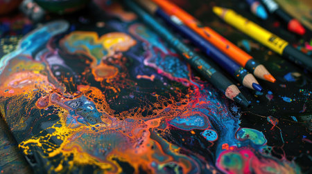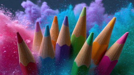 A stunning arrangement of vibrant colored pencils emerges from a swirl of colorful powder, creating an eye-catching artistic composition that inspires creativity.