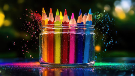 A striking image of a jar filled with colorful pencils, showcased with vivid water splashes and a blurred background, inspiring creativity and artistry.