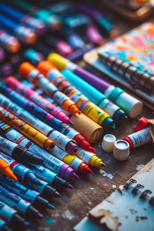 A close-up of a hand engaging in a colorful art project using vibrant markers. The creative workspace is filled with inspiration, showcasing tools for artistic expression.