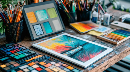 A vibrant collection of art supplies arranged on a rustic wooden table, featuring colored pencils and crayons with a swatch of colors, perfect for creative projects.