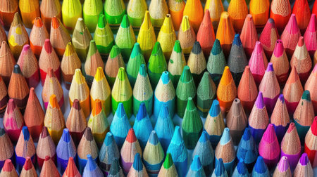 A detailed close-up of sharpened colored pencils arranged in a rainbow of vibrant hues, showcasing creativity, art, and colorfulness.