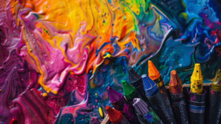 Close-up of a colorful abstract painting with colored pencils lying on top.
