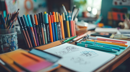 A vibrant workspace filled with colorful art supplies, including an array of pens in a cup, sketches, and scattered papers, showcasing a creative and inspiring environment.