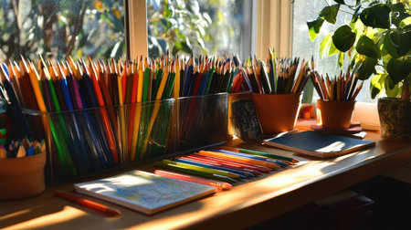 A cozy corner filled with colored pencils and sketchbooks, inviting creativity and imagination, perfect for artists and hobbyists alike.