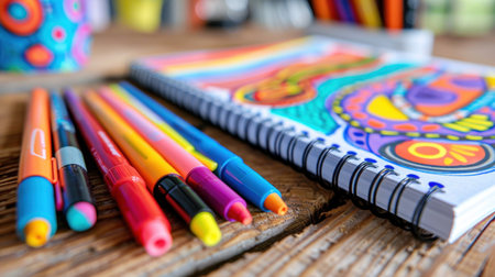 A collection of colorful markers beside a vibrant notepad featuring intricate designs, placed on a rustic wooden table, perfect for artistic projects.