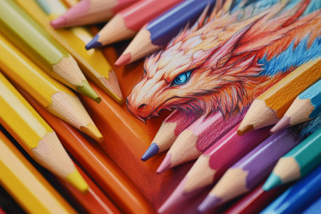 Refined macro shot of colored pencils sorted by color gradient, featuring a drawing of a fantasy dragon head