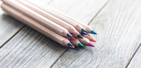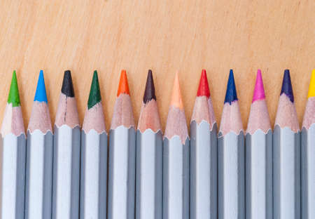 Set of sharp colorful pencils are in a row on a wooden blank board.