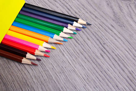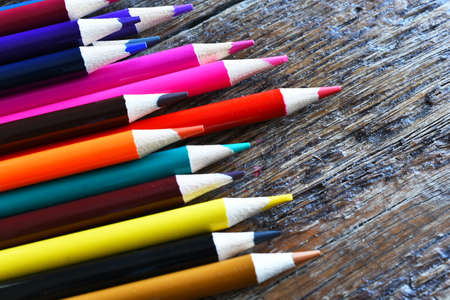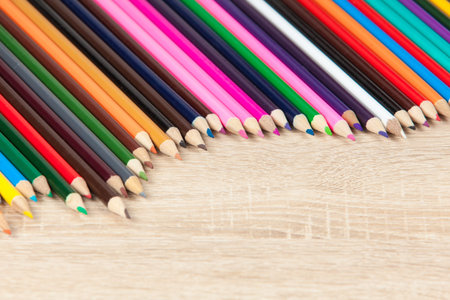 Multicolored pencils collection on wooden background. Row of colored pencils. Top view. Flat lay.