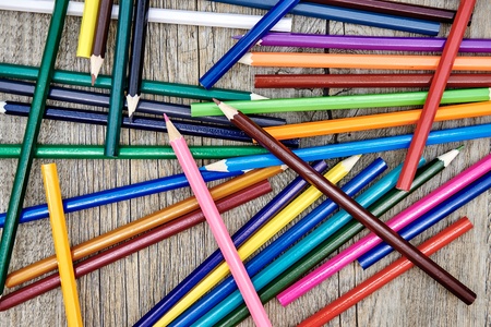 Assortment of colorful pencils arranged on a rustic wooden background, playful and artistic setup
