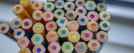 Close-up of a bunch of colored pencils, abstract background with colored pencils macro view