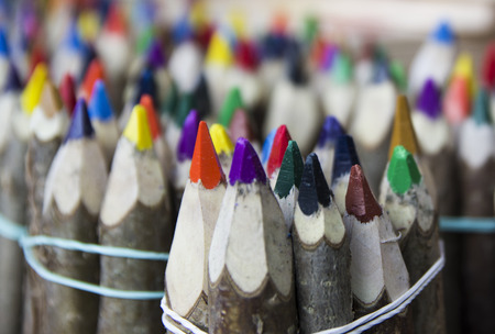 Handcrafted eco-sustainable coloured pencils made with tree branches still covered with bark