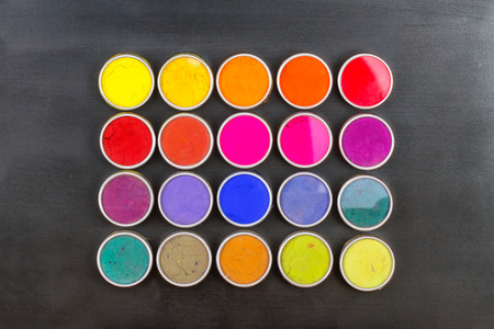 Colorful gouache paints in plastic containers close-up macro photography