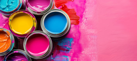 Colorful paint cans background. Top view. Abstract art background.