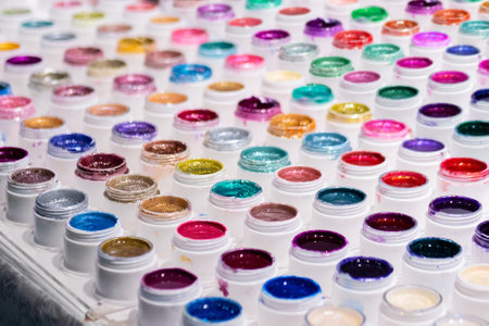 Vibrant mineral eyeshadow in plastic cosmetic jars in row on counter for sale in cosmetics shop, tradeshow. Glamour, fashion, make up, beauty and skincare concept