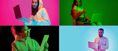 Group of four young people man and women with laptop and tablet isolated on multicolored background in neon light, collage.