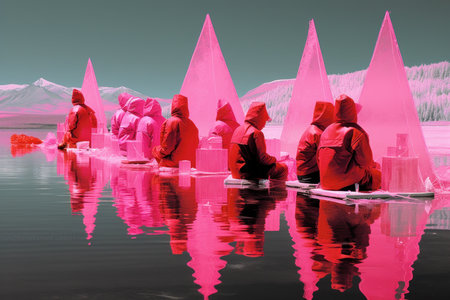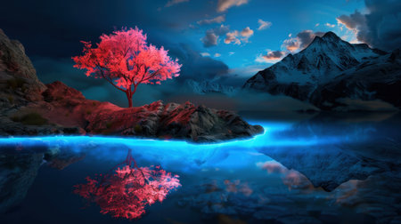 A striking scene featuring a vibrant pink tree reflecting in calm waters with majestic mountains in the background, set against a dramatic dusk sky.