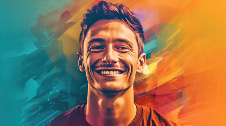 A diverse group of teenagers standing against a vibrant, multicolored background, expressing unity and youth. Perfect for concepts related to friendship, diversity, and modern fashion.