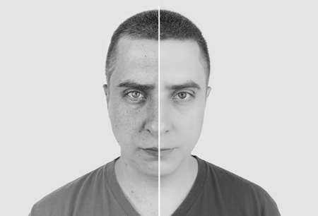 Man's Face Showing Anger And Happy Emotions Against Black Background
