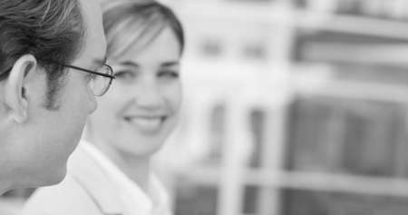 two well-dressed business people standing looking at each other