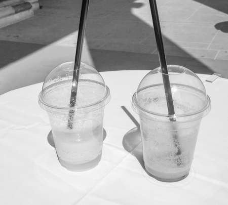 Cocktail glasses on a table at an outdoor event in black and white