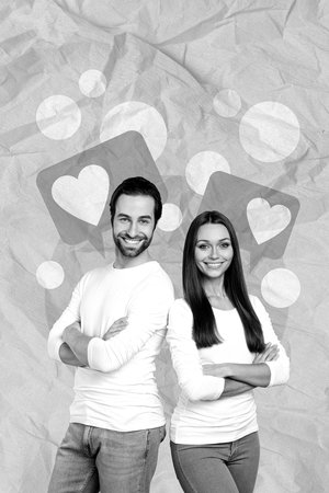 Creative collage template of smiling confident businesspeople arms folded celebrating 14 february isolated drawing background