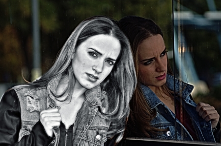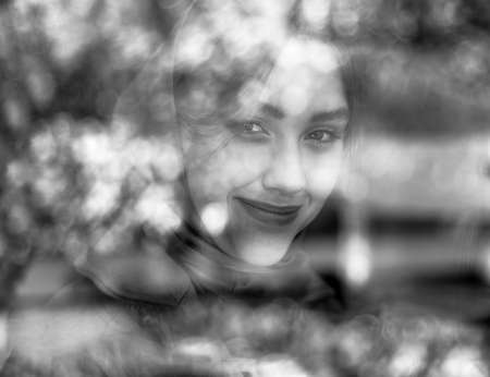 Close-up portrait of a beautiful girl through reflections in the window, black and white photo