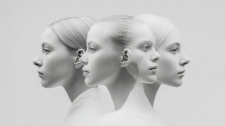 A tranquil monochrome portrait showcasing a woman?s layered profiles that seem to drift and intertwine, evoking themes of reflection, subtle motion, and inner contemplati
