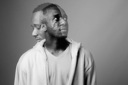 Studio shot of young African man wearing hoodie against gray background in black and white