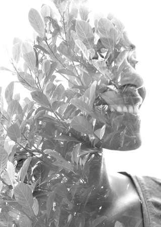 Emotional woman portrait outdoors. Creative. Double exposure. Black and white.